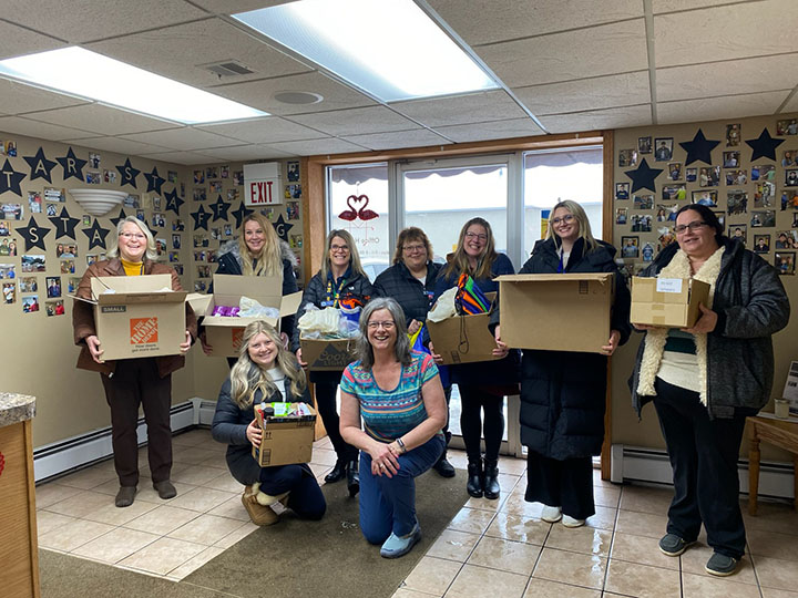News Photo by Darby Hinkley Representatives from area schools and the Foster Closet picked up hygiene items for youth on Tuesday that were collected during the 2nd Annual Dignity Drive. Crouching in front are Elise Leeck with Thunder Bay Junior High, and Dignity Drive Chair Laurel Nowak. Standing, from left, are Holly Jore with Immanuel Lutheran School, Sarah Benjamin with Lincoln Elementary, Lisa Werth with Besser Elementary, Julie Benson with Thunder Bay Junior High, Jolene Price with Hinks Elementary, Paige Bruski with Besser Elementary, and Amy Minton with the Foster Closet.