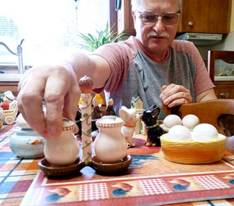 News Photo by James Andersen Alpena resident John Konecki looks over part of his salt and pepper shaker collections on his kitchen table. In more than three decades, Konecki has collected more than 100 sets.