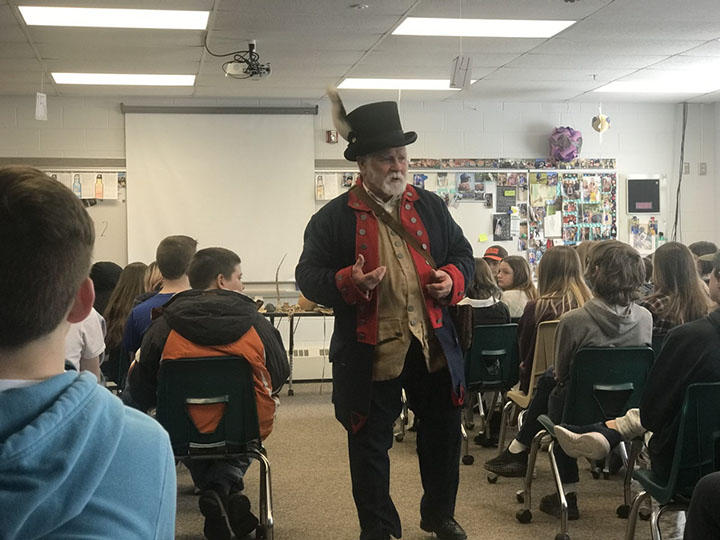 Randy Baker, a professional trained biologist and naturalist and owner of Naturalist Endeavors, led an interactive Lewis and Clark presentation for the eighth-grade PBL/Humanities classes on Wednesday.