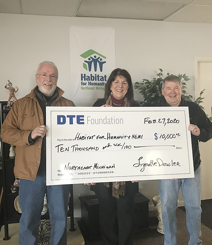DTE Foundation presented a $10,000 check to Habitat for Humanity Northeast Michigan on Thursday at the new ReStore, 2118 Werth Road in Alpena. Pictured from left to right are Ted Fines, executive director of Habitat for Humanity Northeast Michigan, Carla Gribbs, regional manager of Corporate and Government Affairs for DTE Energy, and Max Lindsay, Habitat for Humanity Northeast Michigan board president.