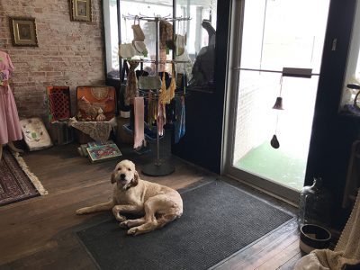 Shop dog Gunner awaits customers while hanging out by the vintage toys, scarves and purses.