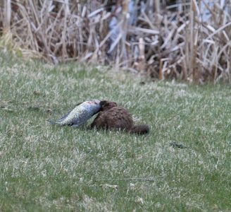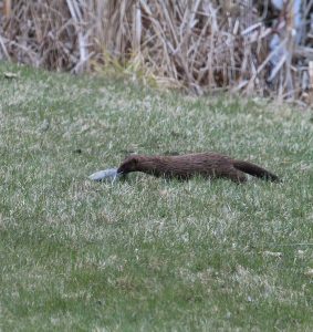 For a moment, the gull left its prize and that quickly lost it. A watching mink scampered across the grass, snatched the fish and quickly retreated into the cattails by the marsh. It was just another little adventure in the sanctuary, and lucky us – we photographed the incident. These photos and description were submitted by Judy Kalmanek.