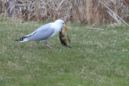 Incredible varieties of animals live in the Alpena Wildlife Sanctuary. The daily dramas surrounding their lives are observable by any of us humans who watch and listen. The photos here tell the story of a herring gull who was skillful and lucky enough to snag a 10-inch blue gill for its dinner. Alas! Not so fast, gull. Other gulls edged in to savor the feast. The gull voiced its displeasure, screaming “Mine, mine, mine!”