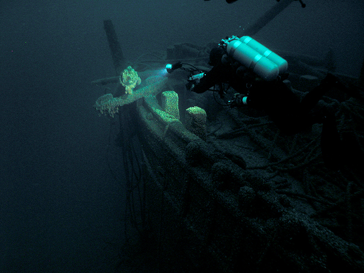 The Windiate is thought to have settled slowly to the bottom of the lake — about 185 feet beneath the surface — because the schooner remains upright with its masts intact.