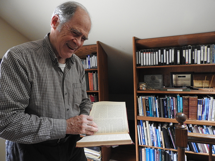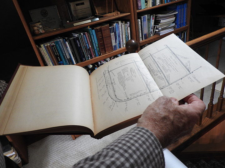 News Photo by Crystal Nelson Maritime historian Pat Labadie thumbs through a book in his home library recently in Alpena. The book explains the requirements needed for a ship to be insured.