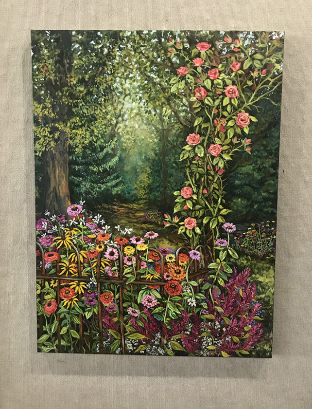 News Photo by Darby Hinkley Katy Jo South created this colorful oil painting featuring flowers in the foreground and a welcoming wooded path lit gently by the sun peeking through the branches. South is one of 34 artists featured in “SummerView.”