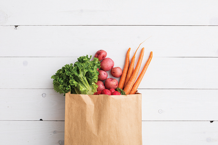 Vegetables spill out of a paper grocery bag.