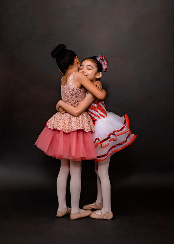 Courtesy Photo by Amy Brownridge Aurora Hernandez and Willow Hernandez embrace in their ballet costumes at Dancing with Joy dance school.