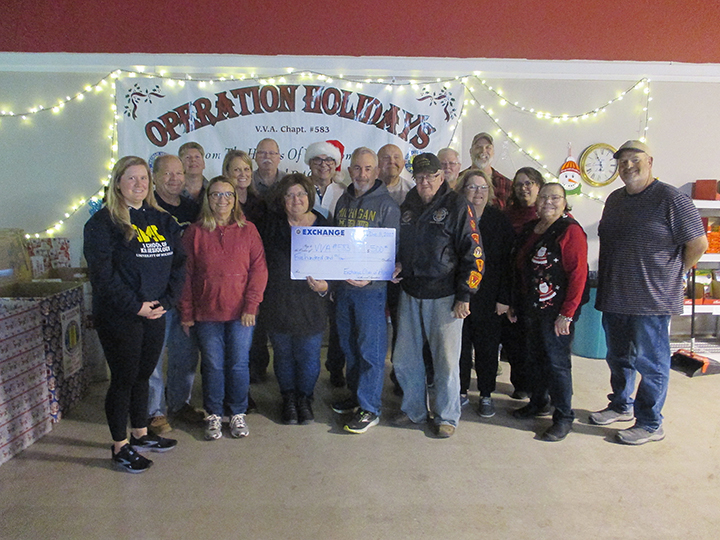 Courtesy Photo Exchange Club Chair Dr. Andy Tarkington presents a check for $500 to Vietnam Veterans Chairs Tammy Kish and Wayne Trapp, while surrounded by Exchange Club of Alpena members at Operation Holidays headquarters.