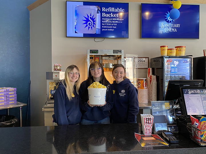 News Photo by Darby Hinkley Sanctuary Cinema Assistant Directors Bradee Sweet, left, and Caitlynn Shadbolt, along with concessions worker Taryn McConnell pose with one of the buckets of popcorn featuring the Alpena Childcare and Development Center logo.