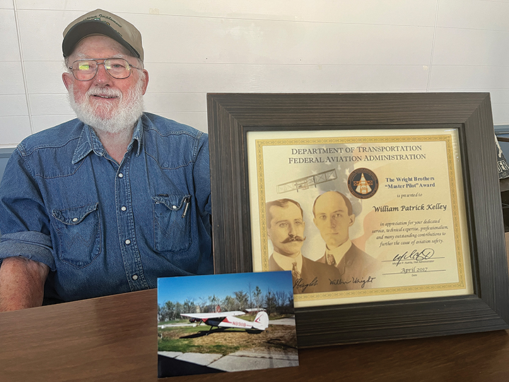 News Photo by Steve Schulwitz Local author and pilot, William Kelley, sits beside his Wright Brothers “Master Pilot” Award and a photo of his plane. Kelley has written many columns for The Alpena News, and has just released his first book, “Wind socks, Grass strips, and Tail-draggers,” available for $20 at The Alpena News. Kelley was a science teacher for 32 years and has been a pilot since 1966. He lives in Herron on the family farm where he was born and raised.