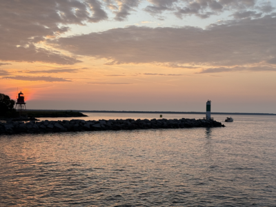 The sun begins to rise over the Alpena Harbor early Tuesday morning as the Edmund Fitzgerald Memorial Swim participants head out onto Lake Huron.
