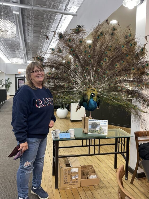 Courtesy Photo Sue Zybytowski is seen with a peacock art piece that she won at the ABC Alpena's Bird Center sanctuary fundraiser on Sunday, which was hosted at Samantha's on 2nd. Ashley Kolnowski, founder and president of the sanctuary, said the peacock was donated for the event and attendees bought raffle tickets to put into a drawing to win the art piece.