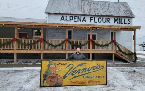 Courtesy photo Robert Rings is seen holding a vintage Vernors sign outside the Olde Mill Coffee in Alpena. He recently purchased the sign from Consolidated Fruit Distributors.