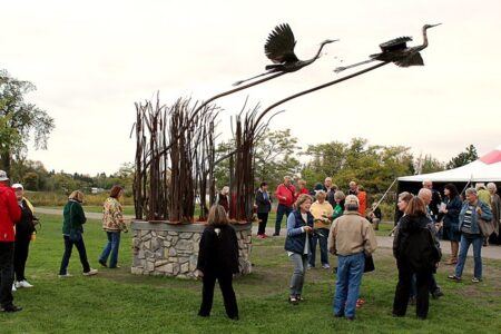 Courtesy photo People are seen gathered around the Departure of the Great Blue Herons sculpture located in Alpena.
