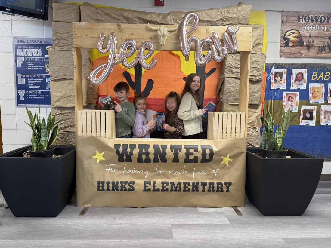 Courtesy photo Hinks Elementary students pose for a photo with books in a wild west-themed display at Hinks Elementary school.