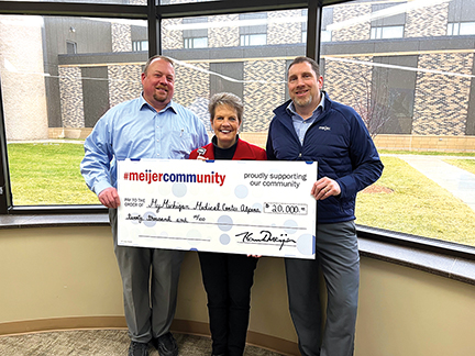 - Courtesy Photo Holding a check to support the new patient tower at MyMichigan Medical Center Alpena is (left to right) Warren Richter, Meijer Alpena store director; Ann Diamond, MyMichigan Health Foundation fund development director; and Karl Kelly, Meijer market director. Richter and Kelly, on behalf of Meijer, recently presented Diamond with a $20,000 donation that will fund a private patient room in the new patient tower.