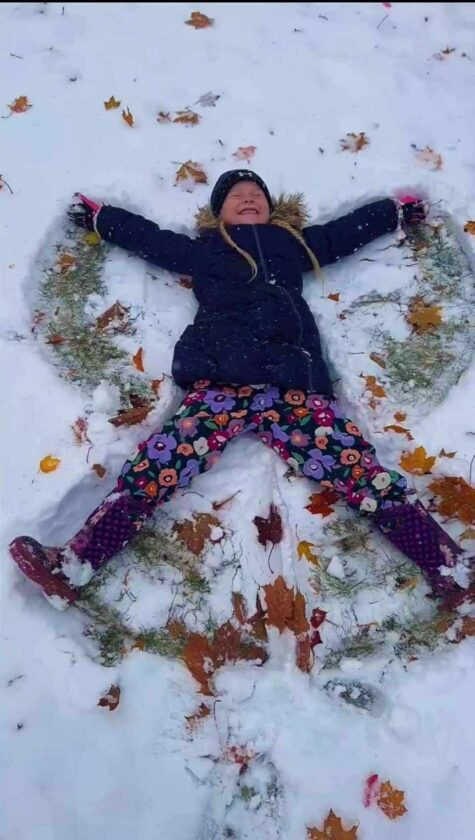 Courtesy photo Evelyn McCreery makes a snow angel while playing outside in the snow in Rogers City on Sunday.