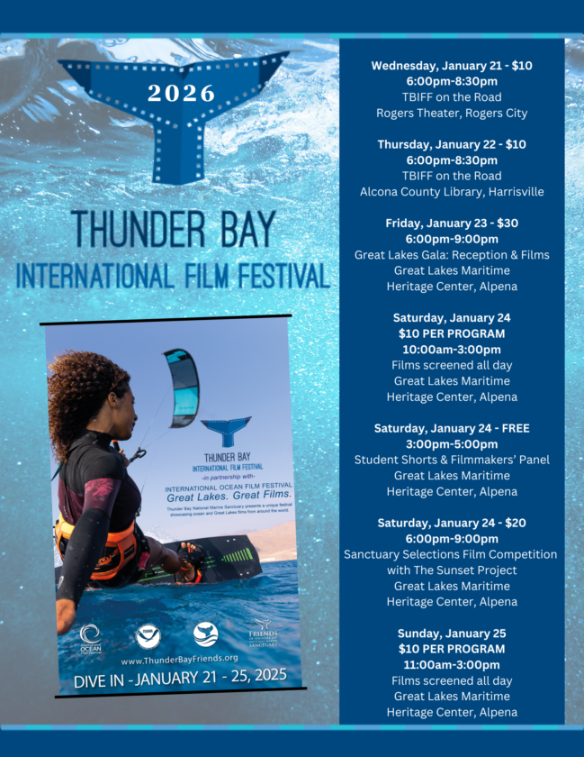 ALPENA — Every year, the Friends of Thunder Bay National Marine Sanctuary bring the world of cinema to Alpena.For five days in January, Northeast Michigan is treated to some of the most impressive ocean and Great Lakes films from around the world during the annual Thunder Bay International Film Festival. Film screenings are complemented by social events, educational activities, and opportunities to meet filmmakers.