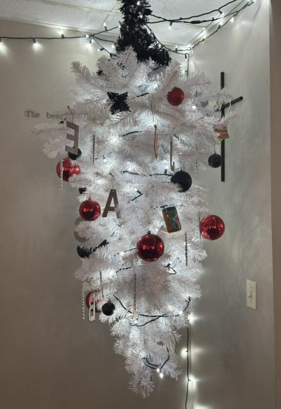 Photo by Jesika Fox Jesika Fox submitted this photo of her Christmas tree that was mounted to her ceiling to The News earlier this month. She said the unique tree display was filled with trial and error and it has fallen down more than once