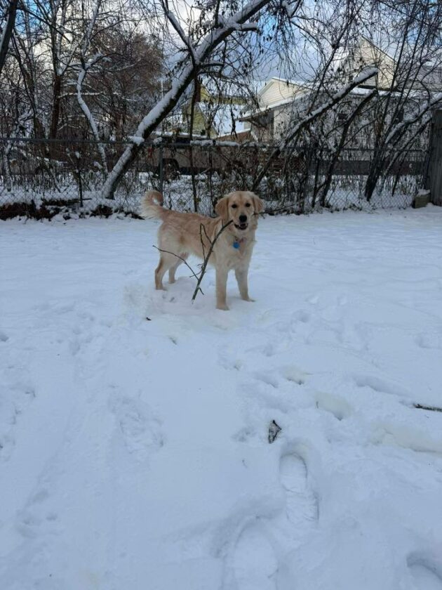 Photo by Ellie Badgero Winnie shows off the stick she plays with while outside in the snow last month. The photo was submitted to The News by Ellie Badgero of Alpena.