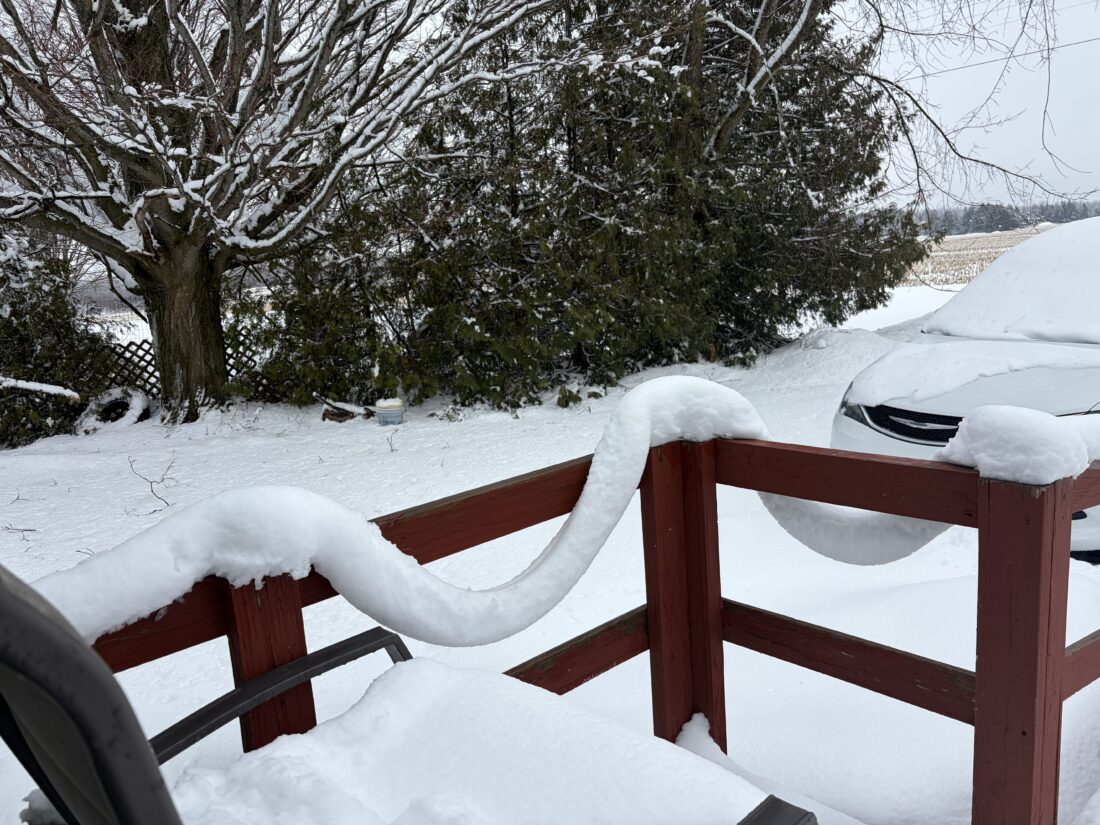 Submitted by Rosemarie Pokorski A formation of snow dangles off the side of a porch for a home in Northeast Michigan. The photo was submitted to The News last week by Rosemarie Pokorski. She said there is no rope or wire propping up the snow, but it just slowly slipped off the rail and froze in place.