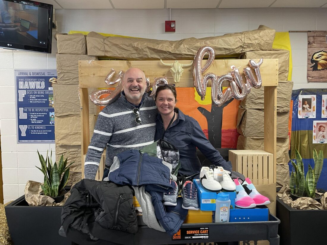 Courtesy photo Pastor John Shipman of St. Paul Evangelical Lutheran Church in Alpena, left, presents Hinks Elementary School Principal Stephanie Hitchcock more than $400 in donated school supplies, clothing, boots, and health items. The donations were made possible through the generosity of the local church.