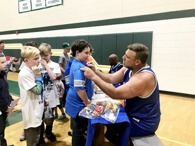 File photo Retired Detroit Lion Brock Gutierrez, who played center from 1996 to 2005, signs his autograph on Hillman 11-year-old Ivan Bahrke’s shirt.