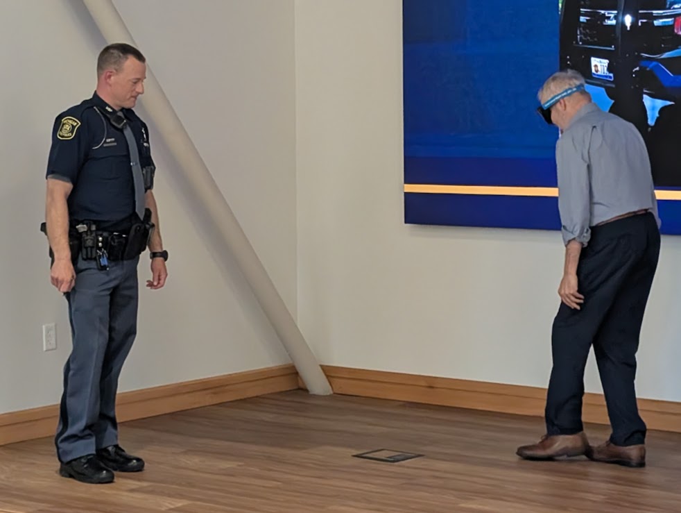 News Photo by Reagan Voetberg Attorney Lou Rabaut, right, demonstrates the use of a pair of goggles from Michigan State Police Alpena Post Community Service Trooper Jason Kunath, left, that make the wearer experience what it feels like to be drunk.