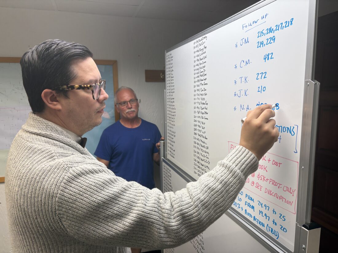 News Photo by Steve Schulwitz Alpena County Administrator Jesse Osmer updates budget numbers on a whiteboard in his office while commissioner Dan Ludlow looks on. The county is expected to have a balanced budget again in 2026 without utilizing as much money from other funds as it has in the past.
