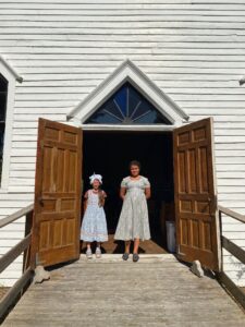The Girl Scouts of St. Paul Lutheran Church in Alpena gave tours of Spratt Church, explaining bits of history to guests. The girls explained that the church was built in 1912 and the pews are exact replicas of the original pews. Guiding guests to the windowsill, the Girl Scouts then noted that a 1919 penny was found in that same windowsill when the church was moved to the museum grounds in 1990. They said the church was heated with a woodstove, and a painting of Jesus was found on the wall behind the cross.