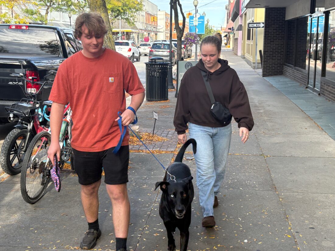 News Photo by Steve Schulwitz Elyja Chism, left, and Braelyn Durfee take Zues for a walk in downtown Alpena on Monday.