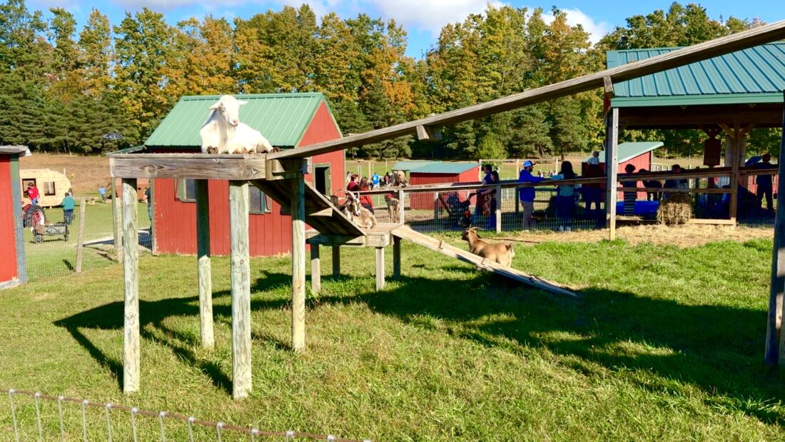 News Photo by Kayla Wikaryasz On Sunday, goats are seen napping on a wooden structure in their enclosure at Knaebe’s Apple Farm and Cider Works. Visitors spent the day feeding animals, picking apples, sampling ciders, and more.