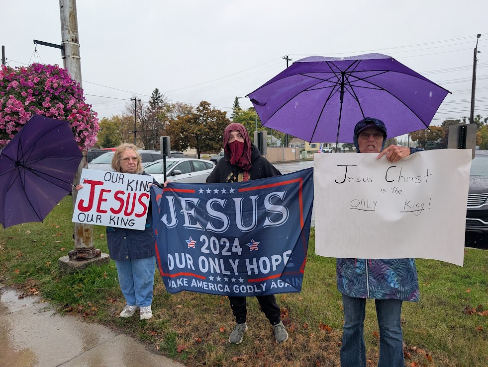 News Photo by Reagan Voetberg Protesters at the One King rally on a rainy Saturday morning hold up signs proclaiming Jesus as king. The rally took place in front of the Alpena County Annex building.