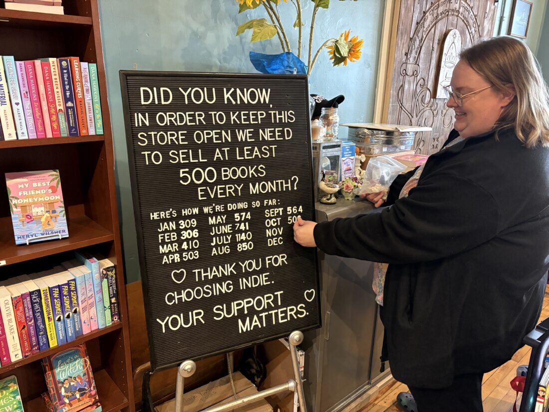 At Parallel 45 Books and Gifts, patrons will notice a board near the cash register that tracks the number of books sold each month. Stafford explained that she started the board when patrons started asking what it takes to keep the store open.