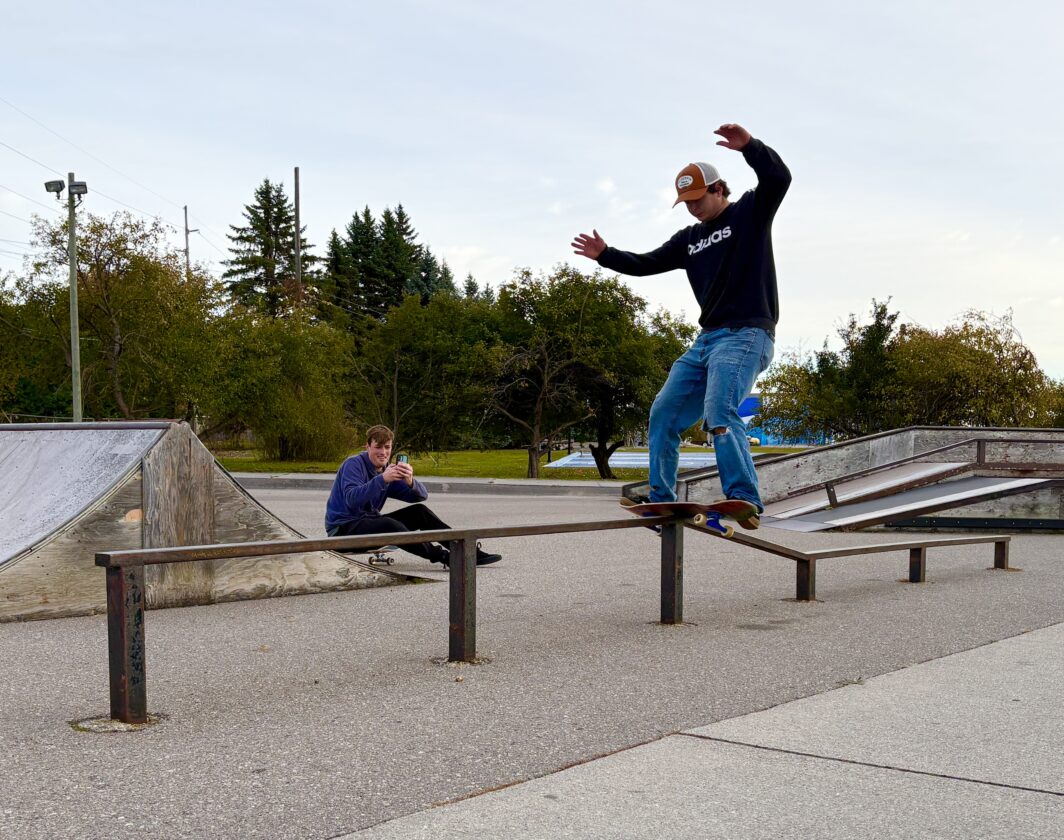 News Photo by Kayla Wikaryasz On Sunday, Evan Thayer is seen skateboarding at the Riverside Skate Park in Alpena. Josh Kozlowski is seen taking a photo of Thayer's trick from behind.