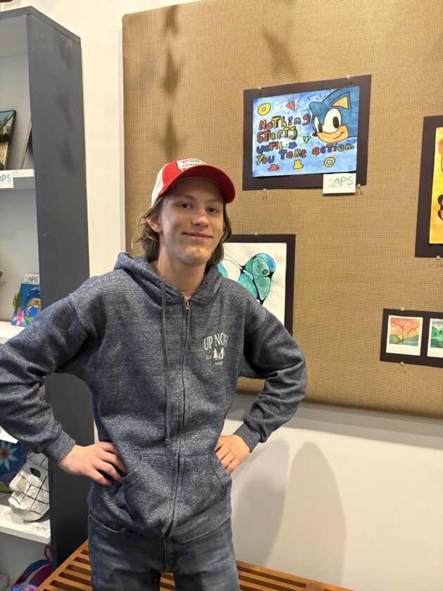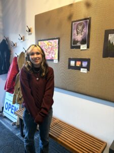 News Photo by Kayla Wikaryasz Kaden Wale, a ninth-grade student at Alpena High School, is seen standing next to his art piece that is exhibited at the Thunder Bay Art Gallery in Alpena. The Thunder Bay Arts Council hosted an artist reception for students that have work featured at the gallery.