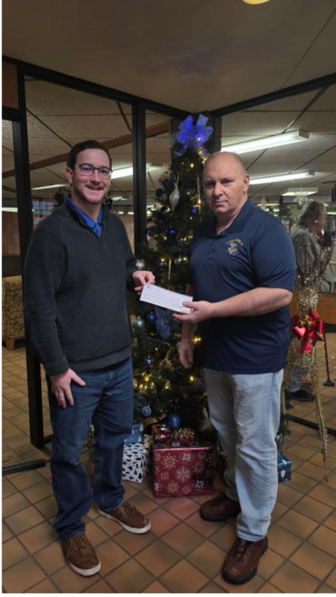 Courtesy photo Dean Kowalewsky, left, presents Bob Bruning, of the Alpena Hopper Masonic Lodge 199, with the check for the $175.00 donation for the local Bikes for Books 2026.