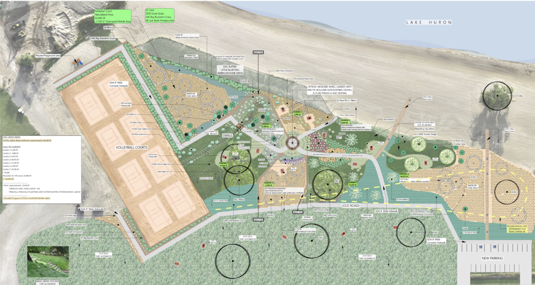 “The addition of volleyball courts and new parking will bring new community activity to the area,” North by Nature says. ” A blatant need for new vegetation in the park is evident. The city of Alpena is ready to advance into sustainable infrastructure, and adding a lush greenbelt style planting with layered habitat is the ultimate goal for the park.”