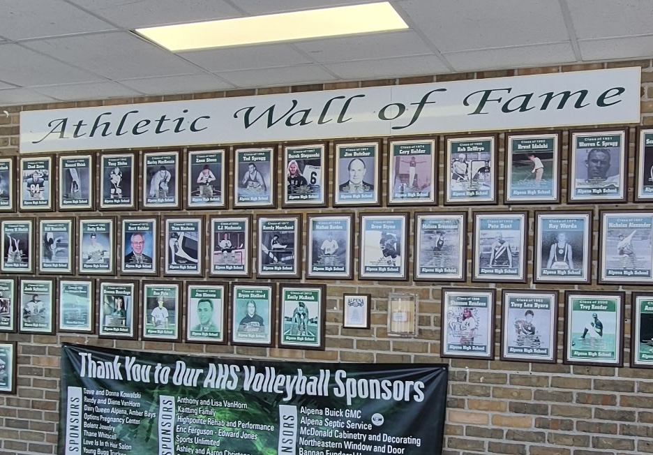 Photo by Josh Jambor The photos of past inductees of the Alpena High School’s class of 2026 Wall of Fame hang on the wall at the school. Six new inductees will be honored during a half-time ceremony at the boys varsity game against Gaylord on Friday.