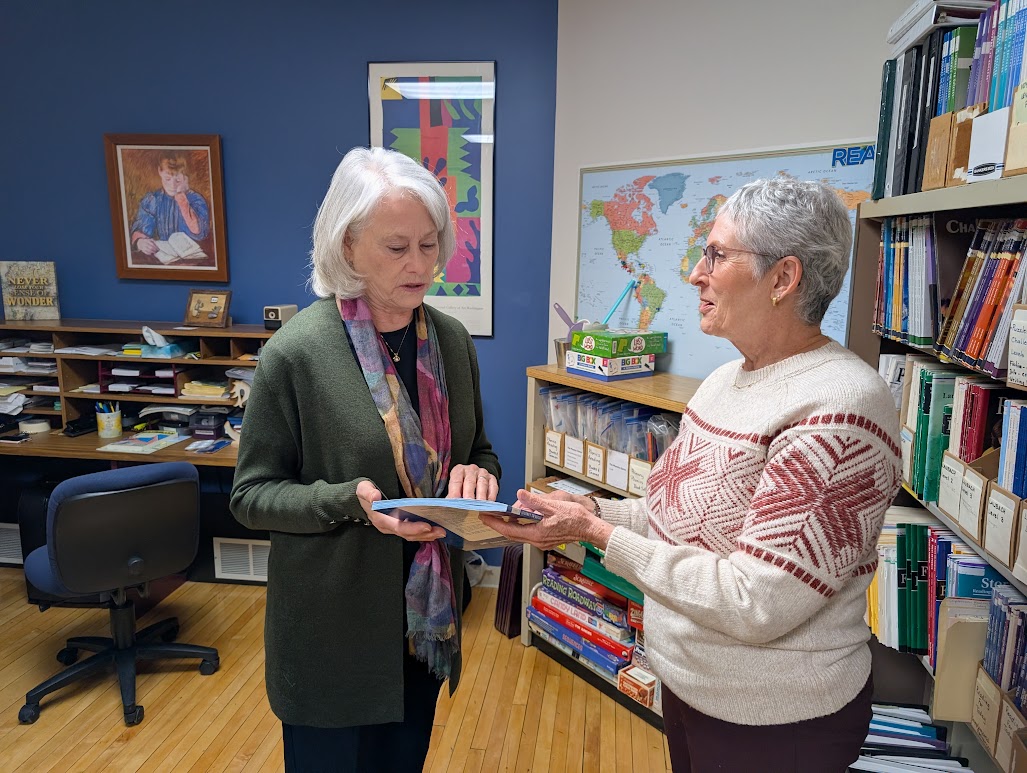 News Photo by Reagan Voetberg READ adult literacy program Coordinators Pat Garant and Leslie Kirchoff discuss tutoring materials on Thursday in the READ program office.