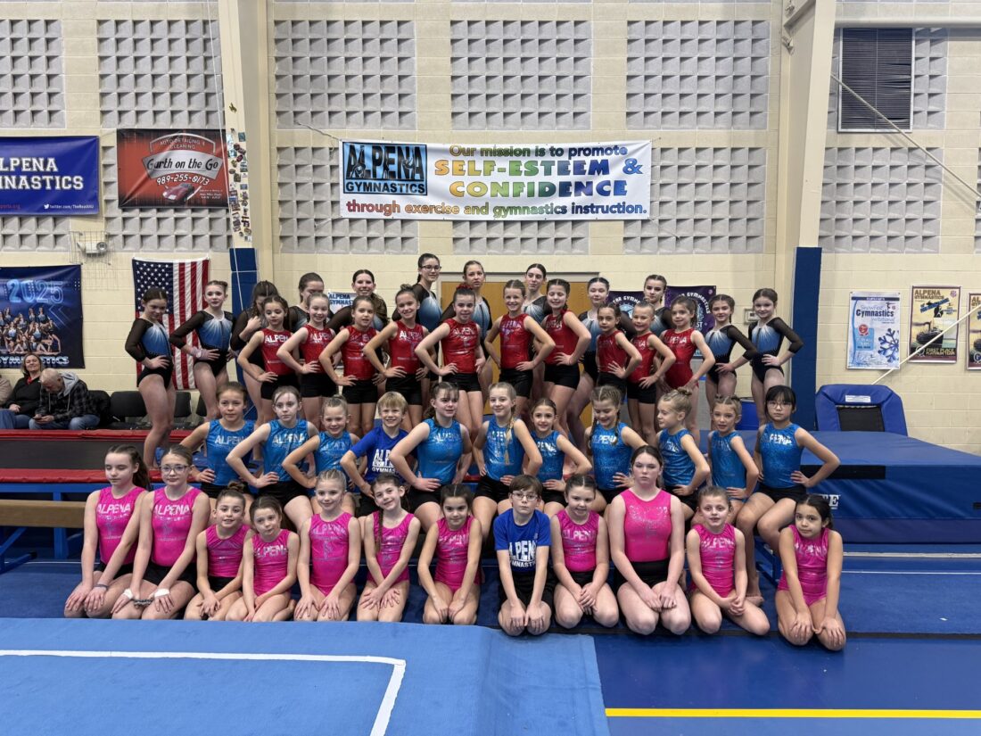 Courtesy photo The Alpena Gymnastics team poses for a photo after competing in an in-house meet. The team competed in routines for the bar, beam, vault, and floor. They received a placement ribbon in each event, and a 2026 meet medal.