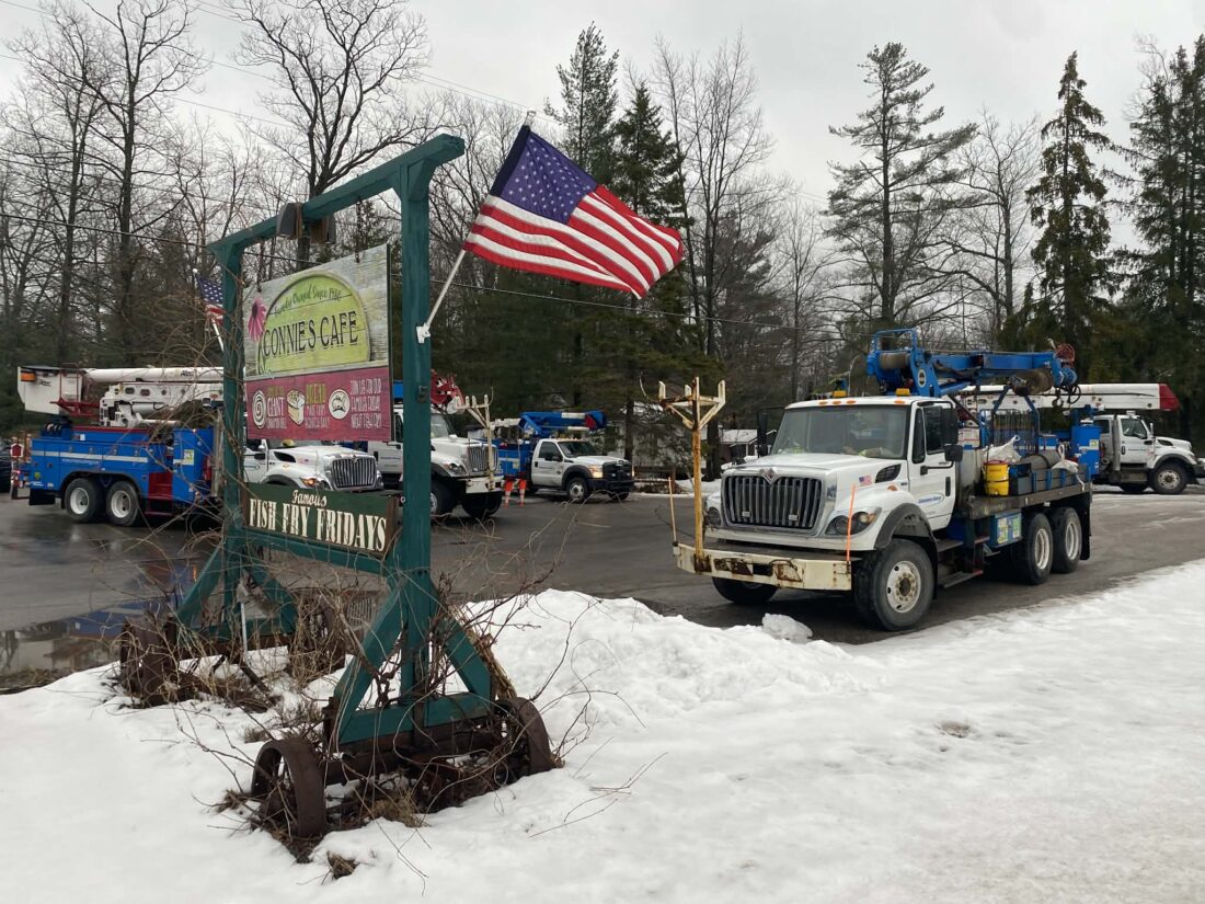 Photo submitted by Kelly Bushey Utility trucks fill the parking lot at Connie’s Cafe in Ossineke on Sunday morning, as the workers enjoy a quick breakfast before returning to work restoring power in Northeast Michigan. Thousands of people lost power last week due to a large ice storm. The utility workers have been successful as many people’s power has been restored.