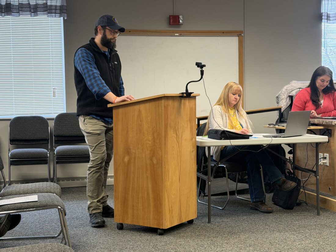 News photo by Kayla Wikaryasz Nick Modrzynski, Alpena County emergency manager, is seen presenting his recap of the 2026 ice storm to the Alpena County Board of Commissioners on Tuesday. He said that Alpena County was prepared to endure the storm.