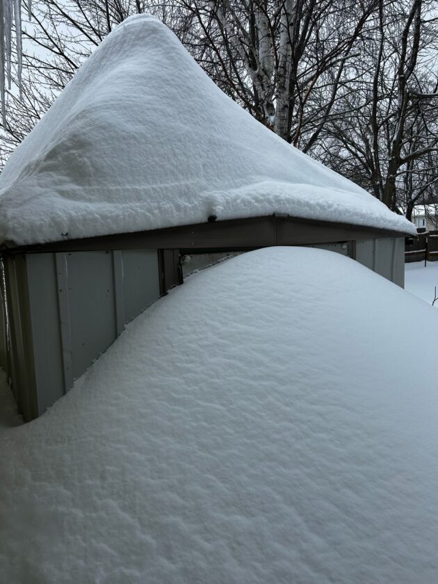 Photo submitted by Pennie Hoeft Large snowdrifts bury a storage shed at a home in Rogers City on Monday. The Rogers City area received several feet of snow but avoided the ice storm that affected areas of Northeast Michigan.