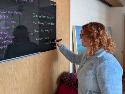 News Photo by Reagan Voetberg Christina Kihn, director of the Center of Charity in Alpena, writes on the Friendship Room menu board on Thursday.
