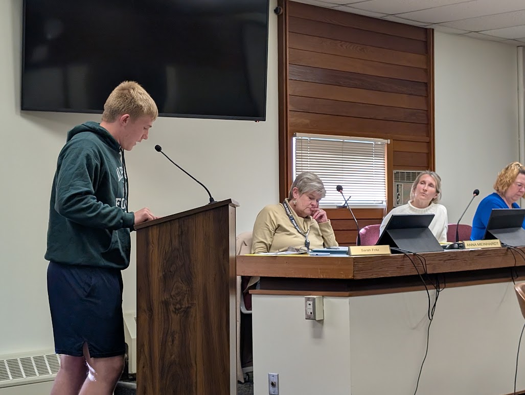 News Photo by Reagan Voetberg Alpena High School student athlete Xavier Szymoniak speaks to the Alpena Public Schools board of education at last Monday’s workshop meeting. Students and coaches attended the meeting to show their support for a new weight room and equipment at AHS.