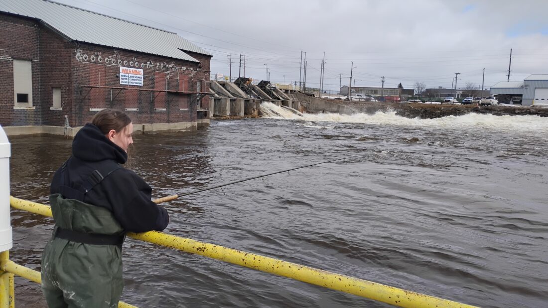 News photo by Josh Jambor Alpena resident Anna Knieczny fishes near the Ninth Street dam on Friday afternoon. The combination of melting snow and additional precipitation has raised concerns regarding flooding and shoots in the dam are already releasing large volumes of water from the Thunder Bay River.