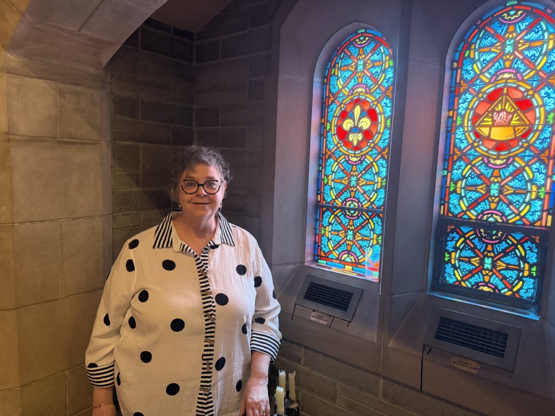 News photo by Kayla Wikaryasz On Friday, Rev. Laura Hoffman is seen standing next to a stained glass window in the First Congregational United Church of Christ (UCC)’s chapel. Hoffman led her first Sunday service as settled pastor yesterday.