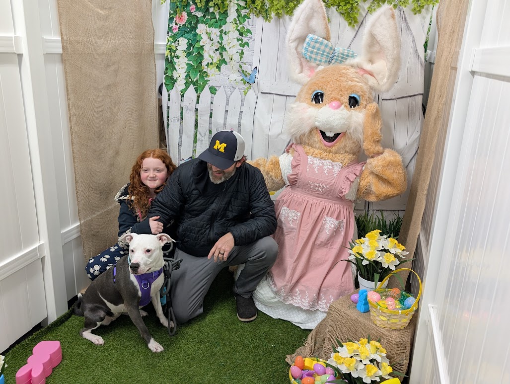News photo by Reagan Voetberg Zuri Somers, Brad Somers, and dog Tala take a photo with the Easter Bunny on Saturday at Go Fetch Pet Supply.